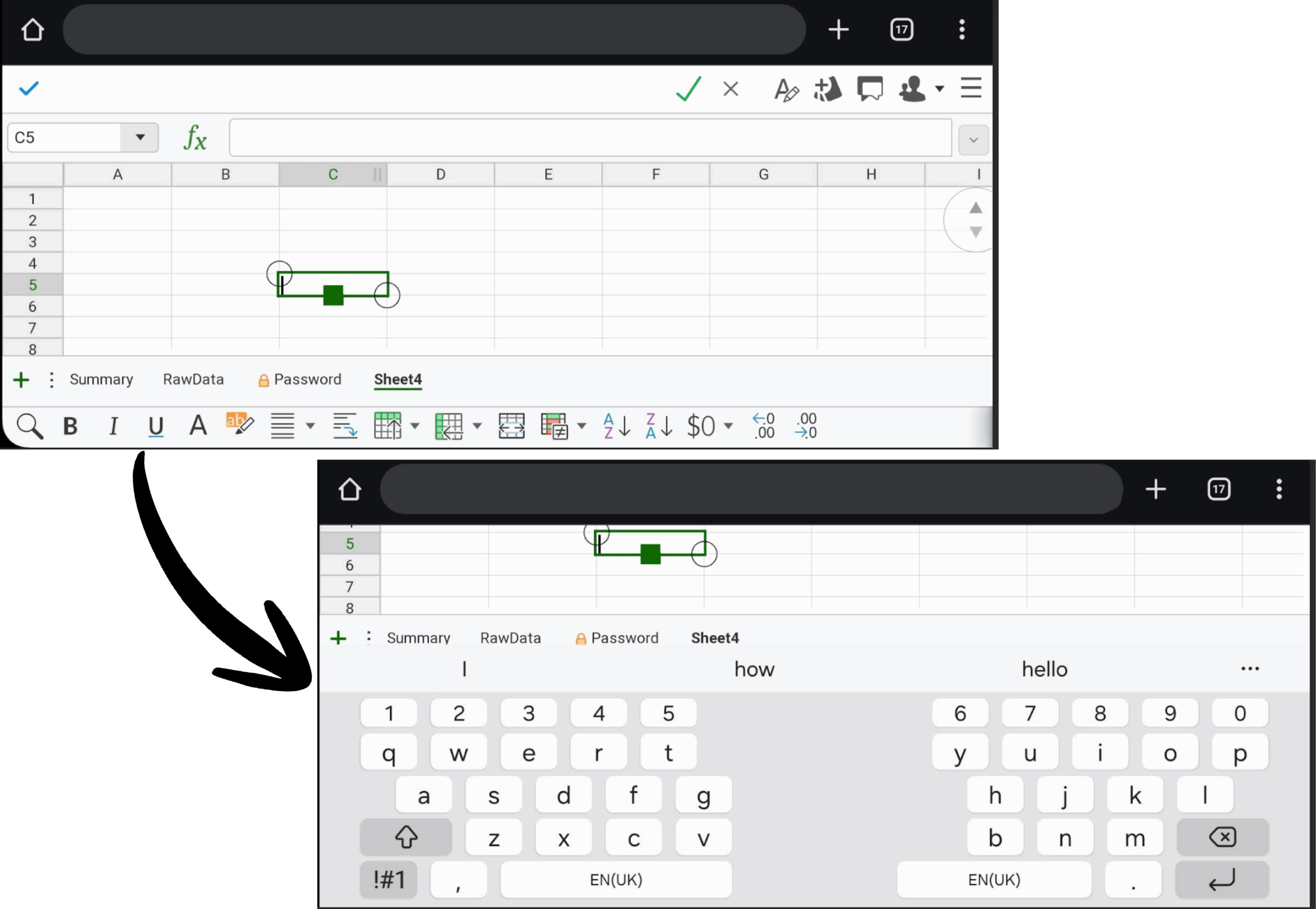 On mobile devices with limited screen height, toolbars automatically hide to maximise the space available for editing content. This improves usability when the on-screen keyboard is visible, preventing situations where the keyboard/toolbars take up all of the screen and leave little or no room for the document itself.