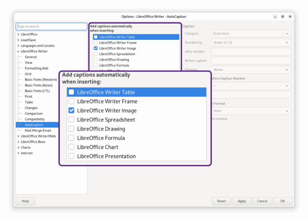 AutoCaptions – When you paste in an image, Writer auto-inserts a caption, as long as you check the box in Tools > Options > LibreOffice Writer > AutoCaptions.