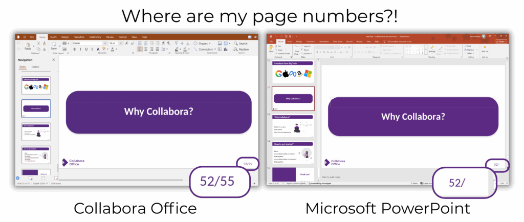 In the case of a feature missing between formats in the Collabora Office suite, we tend touse what we call ‘grab bags’ to temporarily store the document feature before saving it again in its original format. Ideally, PowerPoint would operate more like the Collabora Office suite, and recognise this as information it doesn’t fully understand but that should be retained somehow. Unfortunately that is not the case.