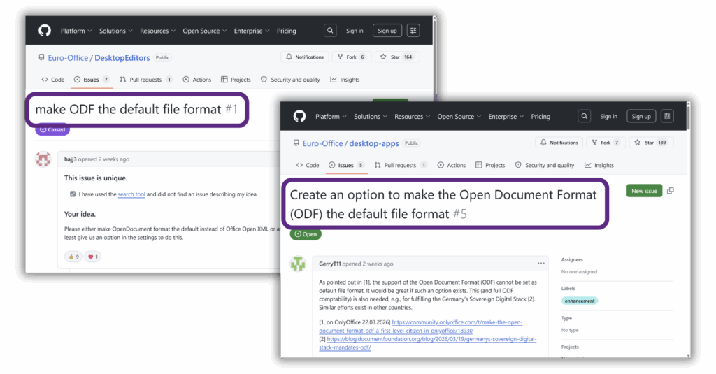 Regrettably, this principle is not well understood by many, even by those who are aware of the problem of dependency on Microsoft’s OOXML. Two of the first five issues raised in a new office suite’s GitHub repos are duplicate requests for the suite to default to ODF. Unfortunately the office suite in question is based on a document editor that primarily speaks OOXML and has poor ODF support, so the requests are unlikely to be actioned.