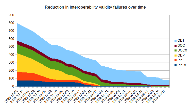 Among other efforts to improve interoperability, over the past year we have been focusing on validity testing of about 243 000 documents, spreadsheets and presentations in various formats converted to the corresponding OOXML format, with the goal of getting to zero. The following chart shows the progress over the last few months for spreadsheets and presentations.