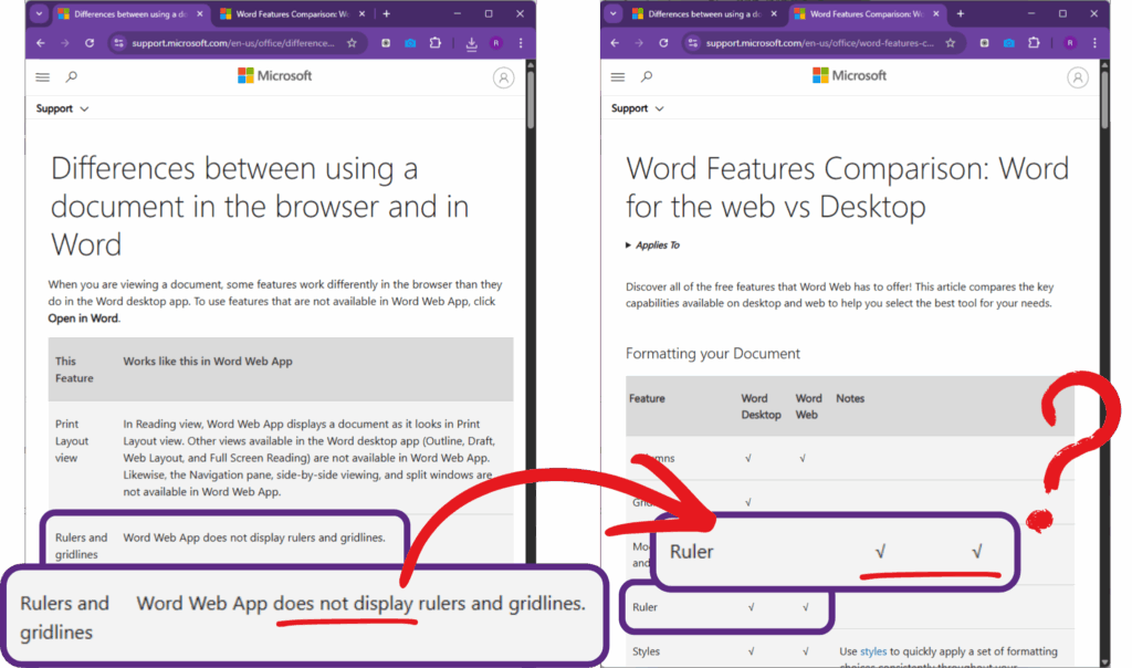 Many (most?) Microsoft Office users will have noticed that Microsoft Office features look and behave differently depending on if a document is opened in the browser, or using the desktop app. This is because the applications known to most as “Microsoft Office” are in fact two independently developed applications – Word Desktop and Word Web. Confusing the situation further, Microsoft appears to have multiple and slightly differing descriptions of how features operate between the two.