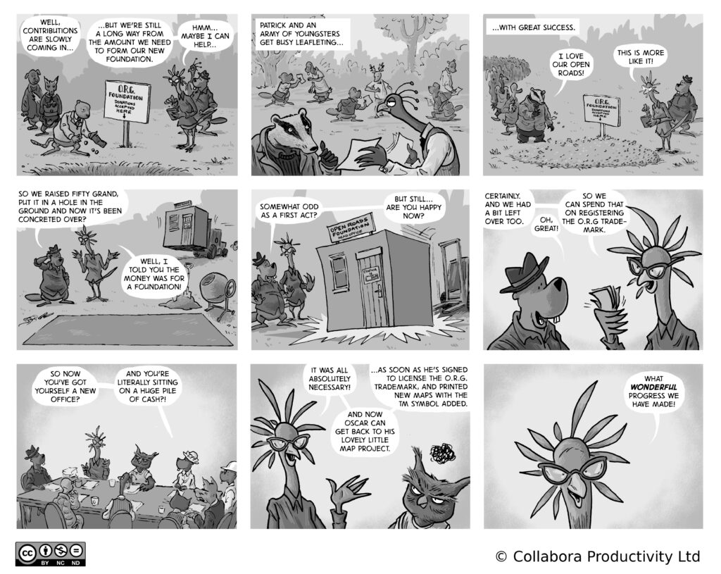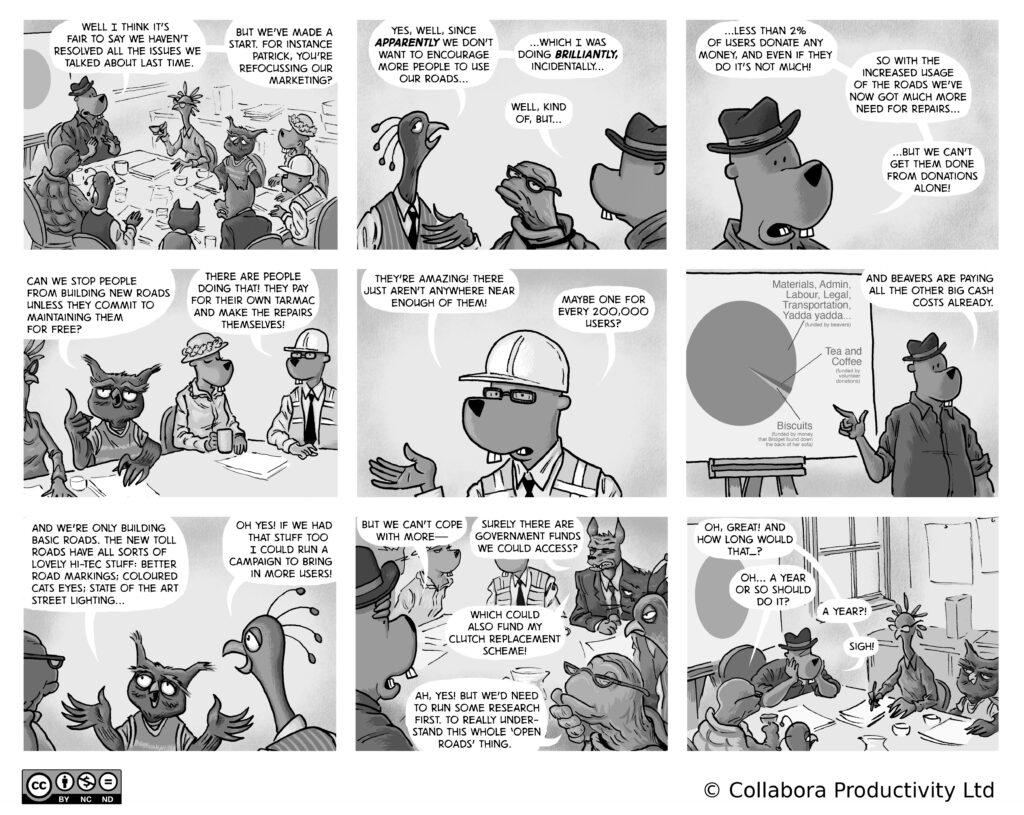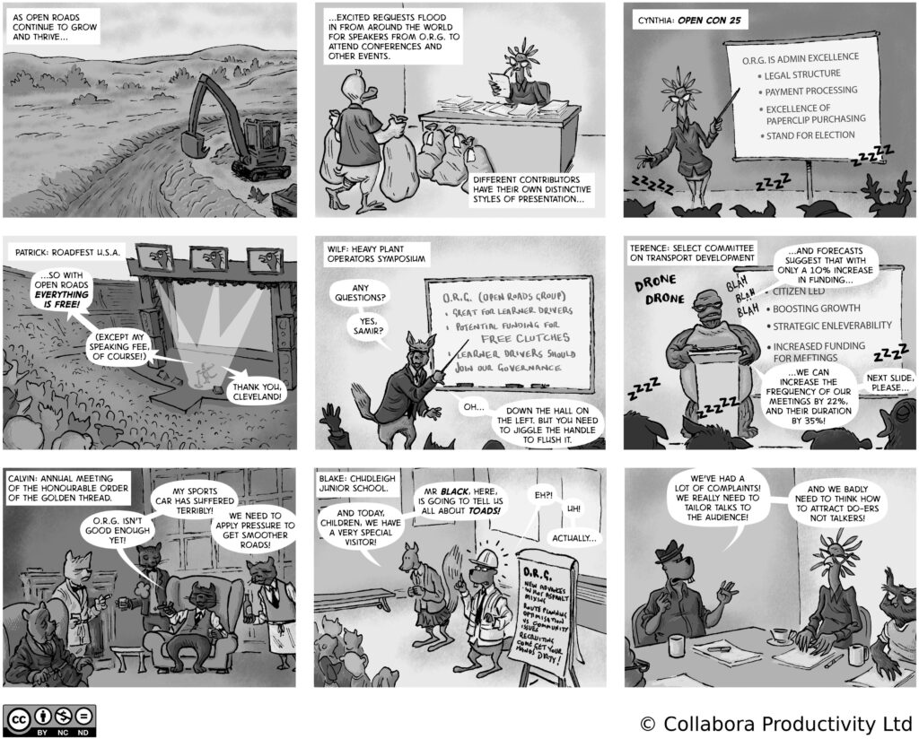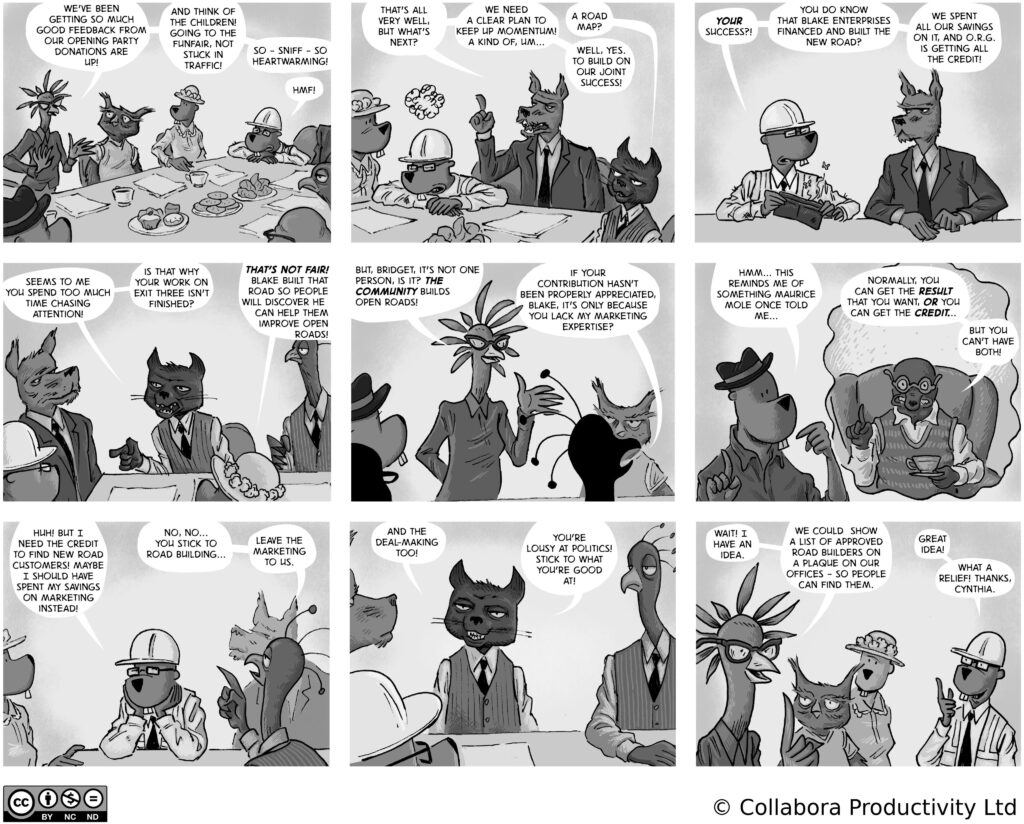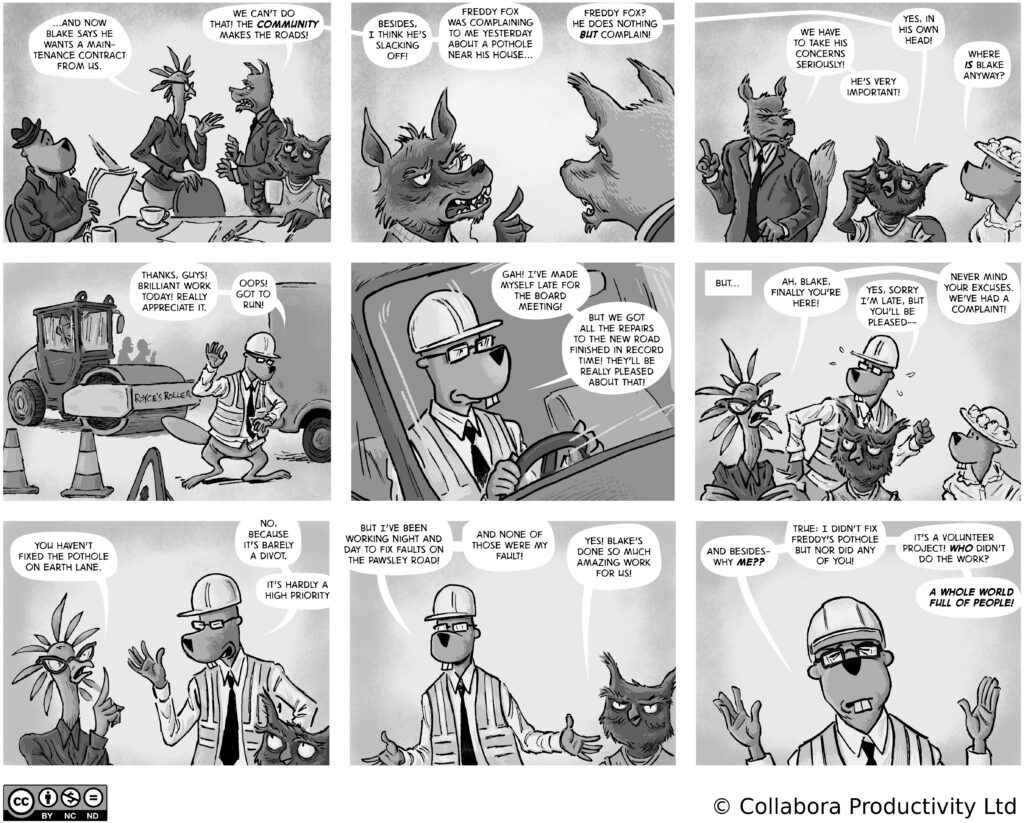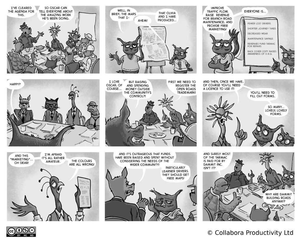 A comic strip about communities, software and companies