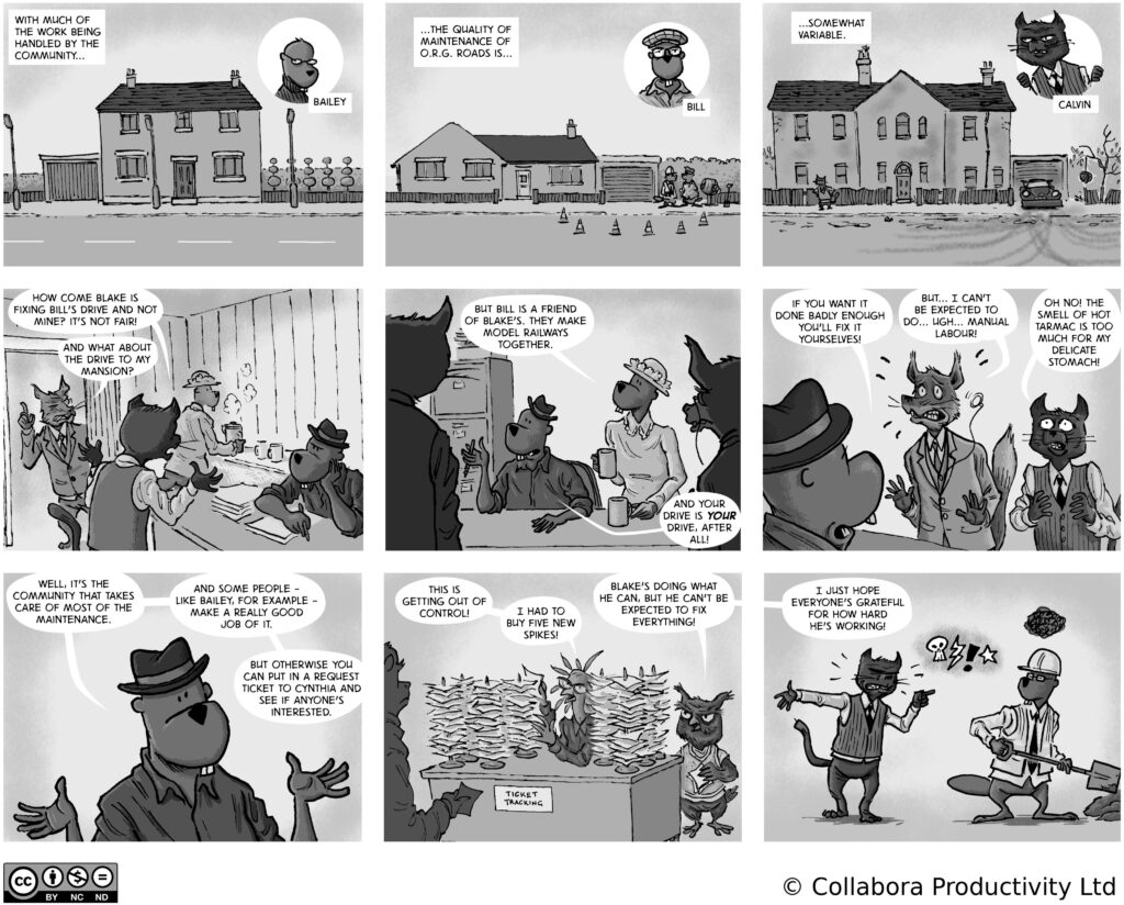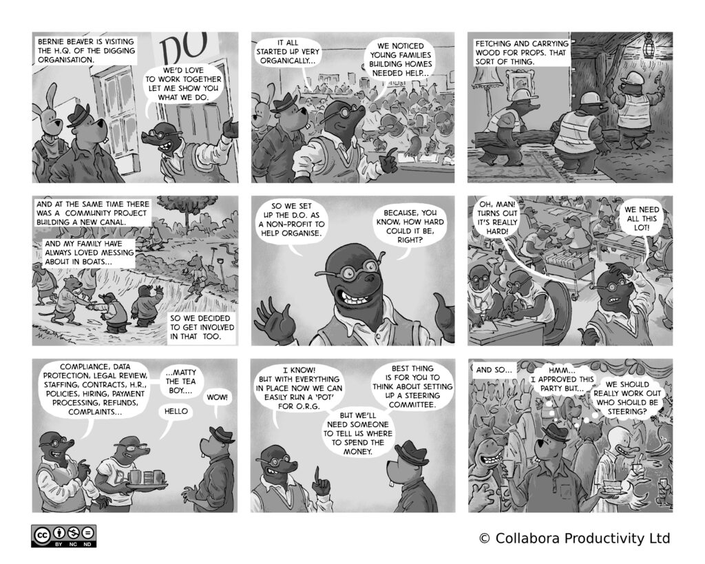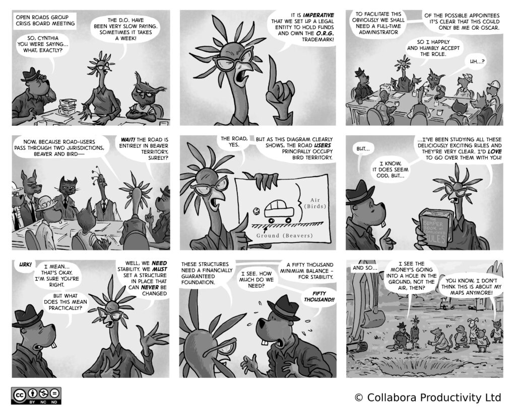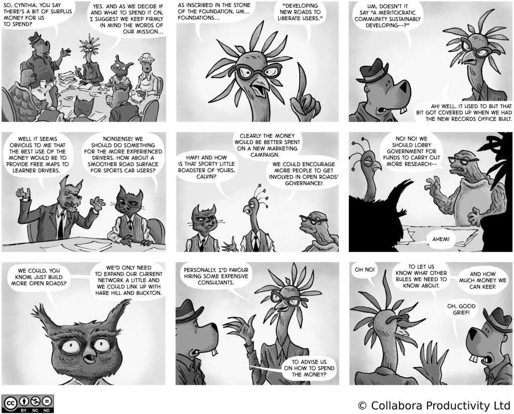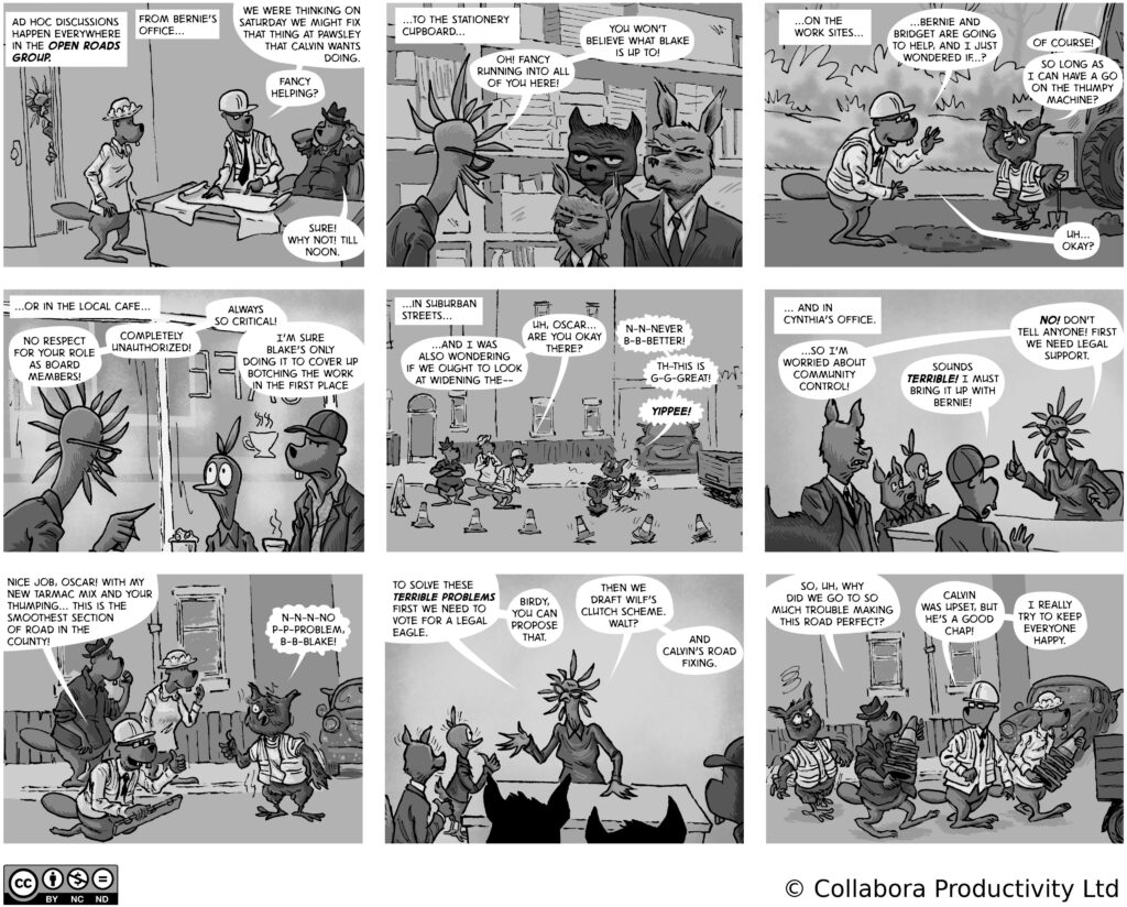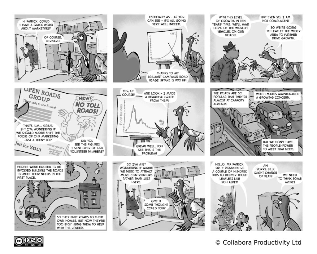 A comic strip about communities, software and companies